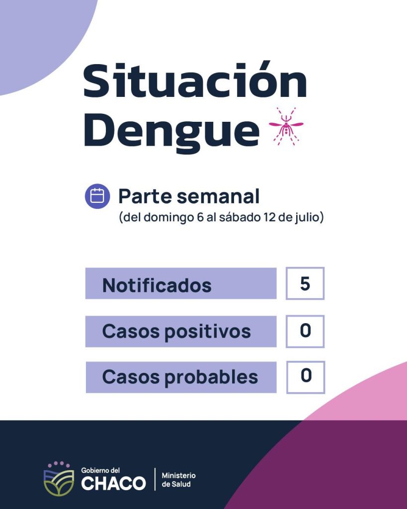 GOBIERNOINTERES GENERALPROVINCIALESSALUD CHACO: OTRA SEMANA SIN CASOS POSITIVOS DE DENGUE Omar julio 14, 2025julio 14, 2025Parte semanal de DengueEl Ministerio de Salud del Chaco brinda el parte correspondiente a la Semana Epidemiológica del domingo 6 al sábado 12 de julio.Durante ese periodo se recibieron 5 notificaciones, sin detectarse casos probables ni positivos.