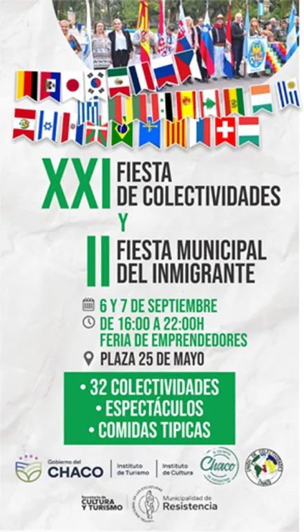 La Fundación Unión de Colectividades del Chaco invita a participar de la 21° Fiesta de las Colectividades y 2° Fiesta Municipal del Inmigrante, un evento cultural que se realizará este sábado y domingo, de 16 a 22, en la Plaza 25 de Mayo. La entrada es libre y gratuita.