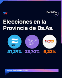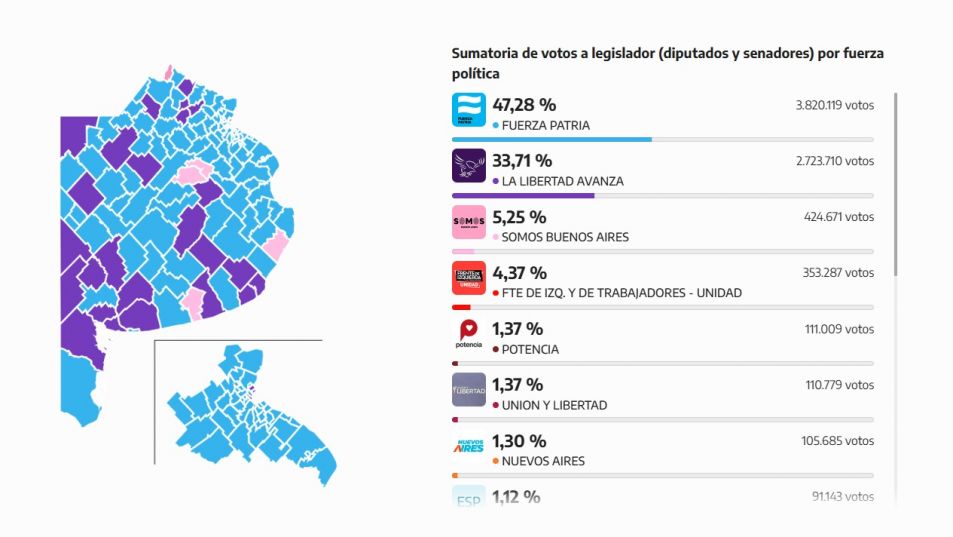 Con el 98,96% de las mesas escrutadas, el peronismo se impuso en la provincia al alcanzar el 47,28% de los votos; LLA queda segunda, con el 33,71%
