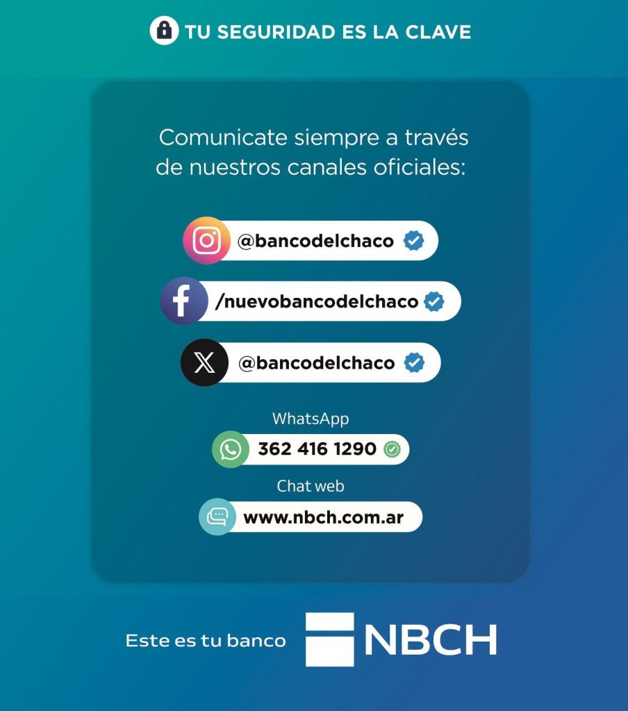 El Nuevo Banco del Chaco (NBCH) recuerda a sus clientes que nunca solicitará realizar simulaciones de préstamos, cambiar contraseñas, instalar aplicaciones o transferir dinero bajo ningún concepto.