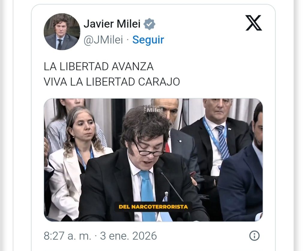Javier Milei hizo otra vez gala de su sumisión a Donald Trump y salió a festejar la captura de Maduro. “Viva la libertad carajo”, celebró en un posteo en X, que completó con un video de su participación en la última cumbre del Mercosur donde dijo que la Argentina acompañaba la presión de Estados Unidos para “liberar al pueblo venezolano”.