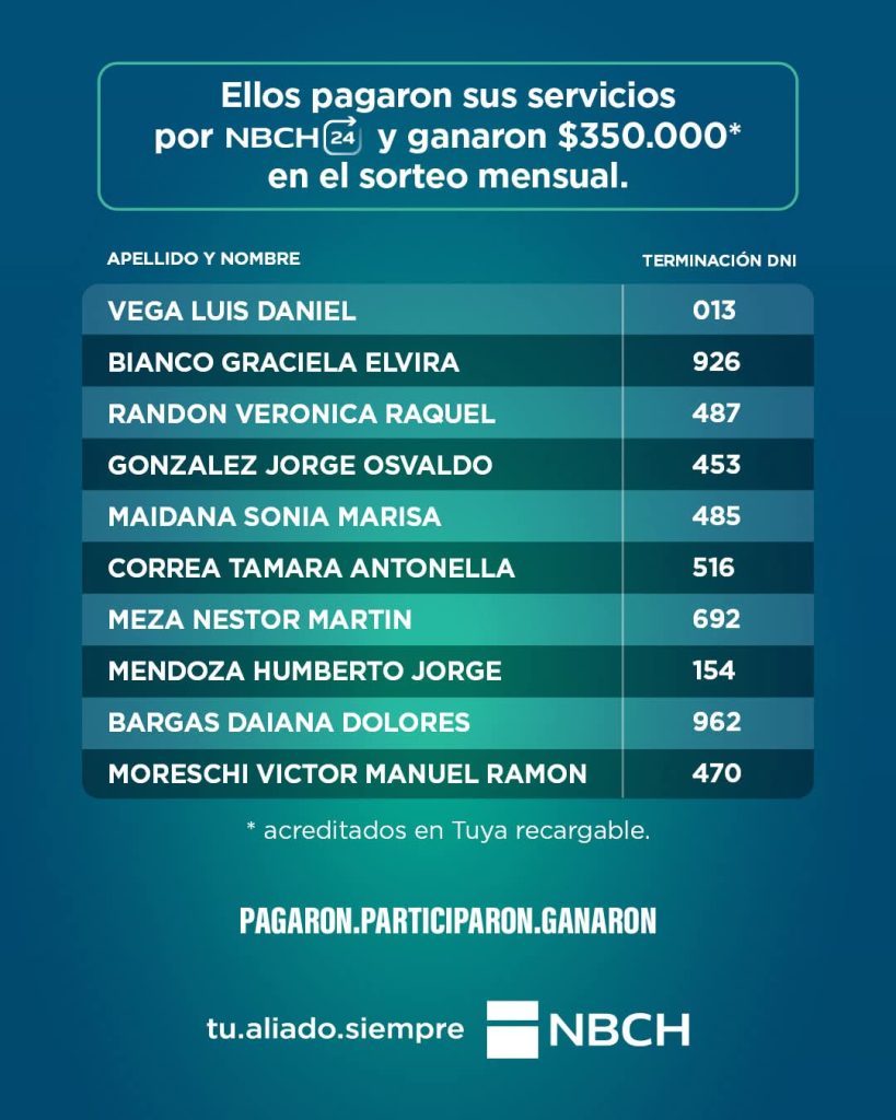 La entidad bancaria felicita a los nuevos ganadores del sorteo por pagar sus servicios a través de NBCH24 en el mes de diciembre.