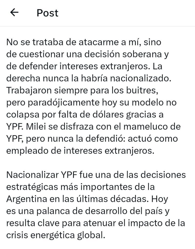 “Se hizo justicia. Los buitres no siempre ganan. YPF es de los argentinos. El futuro también”, escribió Kicillof también en una publicación en redes sociales, en la que le apuntó a Milei.