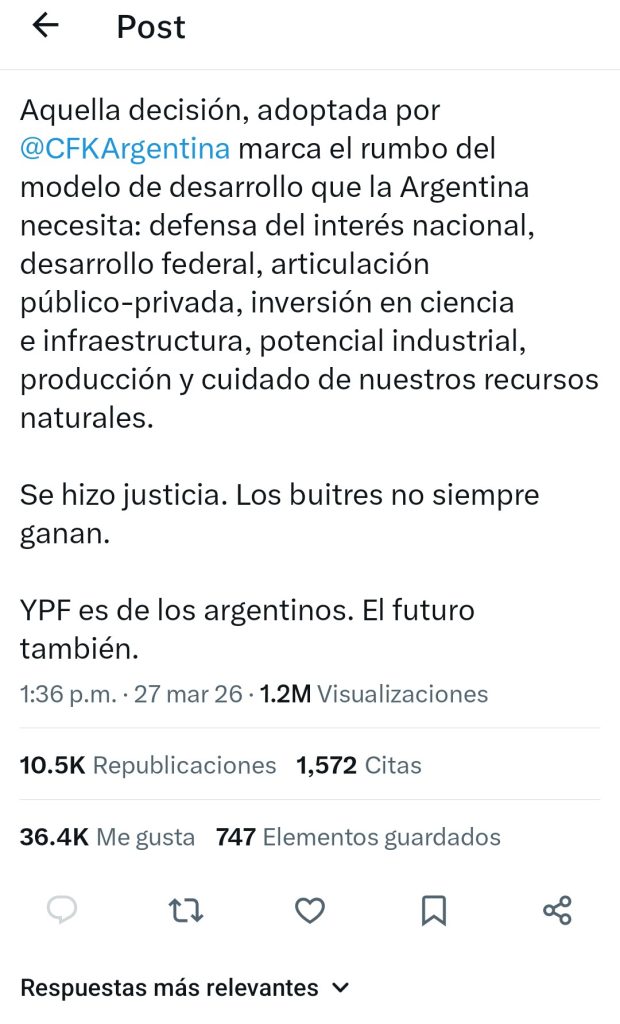 El gobernador bonaerense agregó que “mientras Milei hablaba del ‘impuesto Kicillof’, los propios abogados del Estado argentino, desde que se inició el juicio, defendían en la Justicia los mismos argumentos que sostuvimos siempre. Ese “impuesto” nunca fue más que una operación: un coro de voces que repitió durante años los argumentos de los buitres, instalando que la nacionalización había sido técnicamente incorrecta. ¿Era desconocimiento, ingenuidad o una mentira interesada? Hoy queda claro».