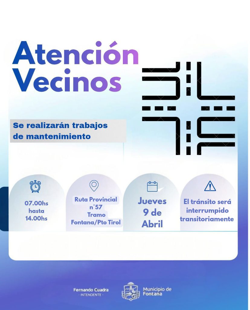 Este Jueves 9 de abril, la Dirección de Vialidad Provincial (DVP) realizará tareas de mantenimiento en la Ruta Provincial N° 57, en el tramo que une Fontana y Puerto Tirol.