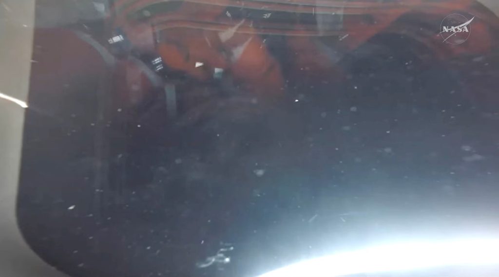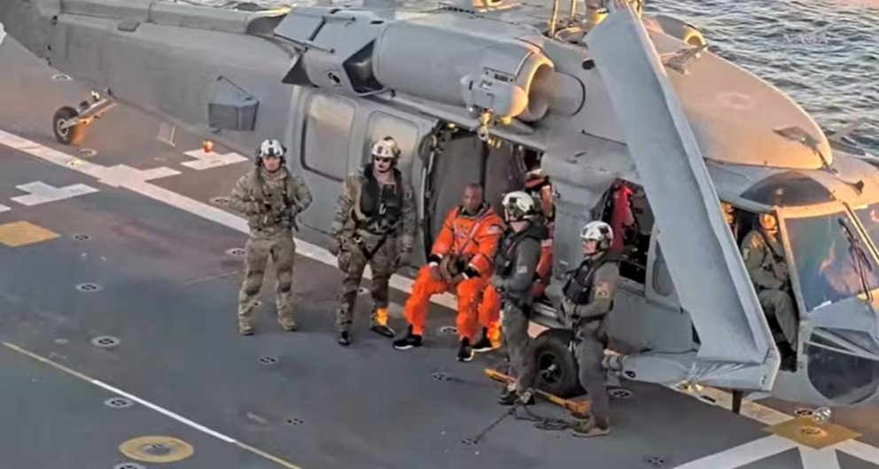 Victor Glover en el helicóptero luego de ser rescatado de la capsula Orion tras el amerizaje en el océano Pacifico